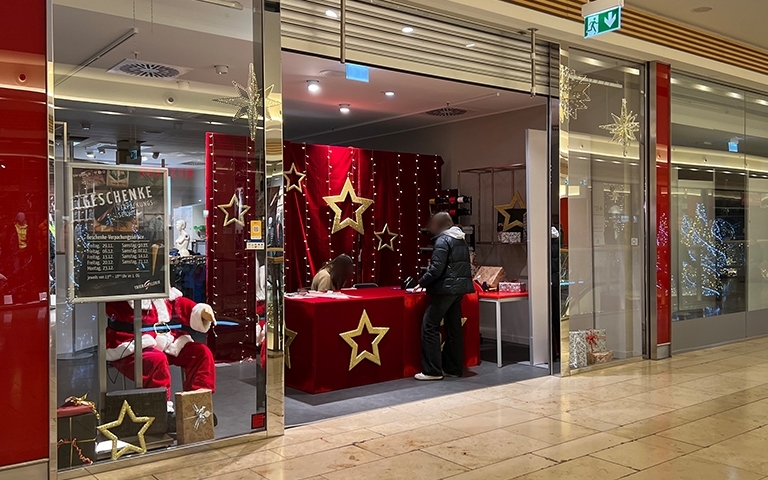 Direkt neben der Eisdiele im Obergeschoss finden alle Schenkenden eine Station, an der sie ihre frisch geshoppten Geschenke ansehnlich verpacken lassen können. Für alle, die zwei linke Hände haben, wenn es ums festliche Verpacken geht, eine echte Hilfe! Geöffnet ist der Service immer freitags und samstags sowie am Montag, 23.12.2024, jeweils von 13-18 Uhr.